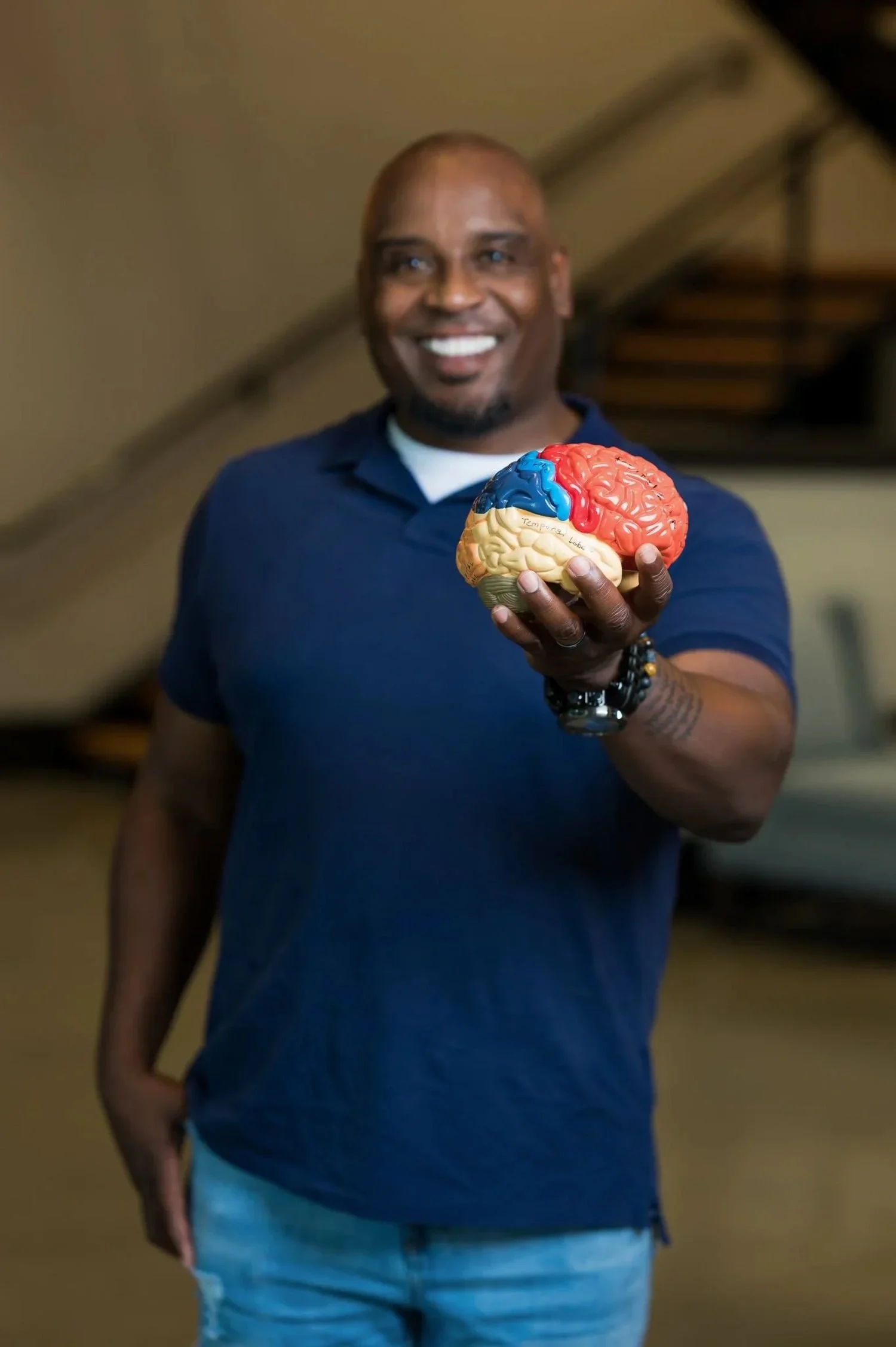 A smiling man holding a colorful model of a human brain in his hand, standing indoors.