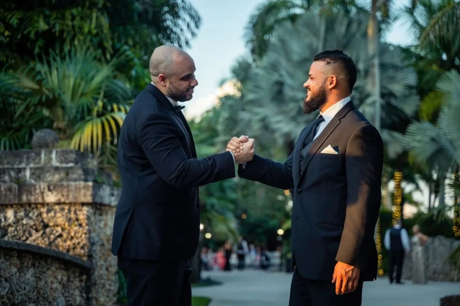 Two men in tuxedos shaking hands outdoors among palm trees, smiling at each other.